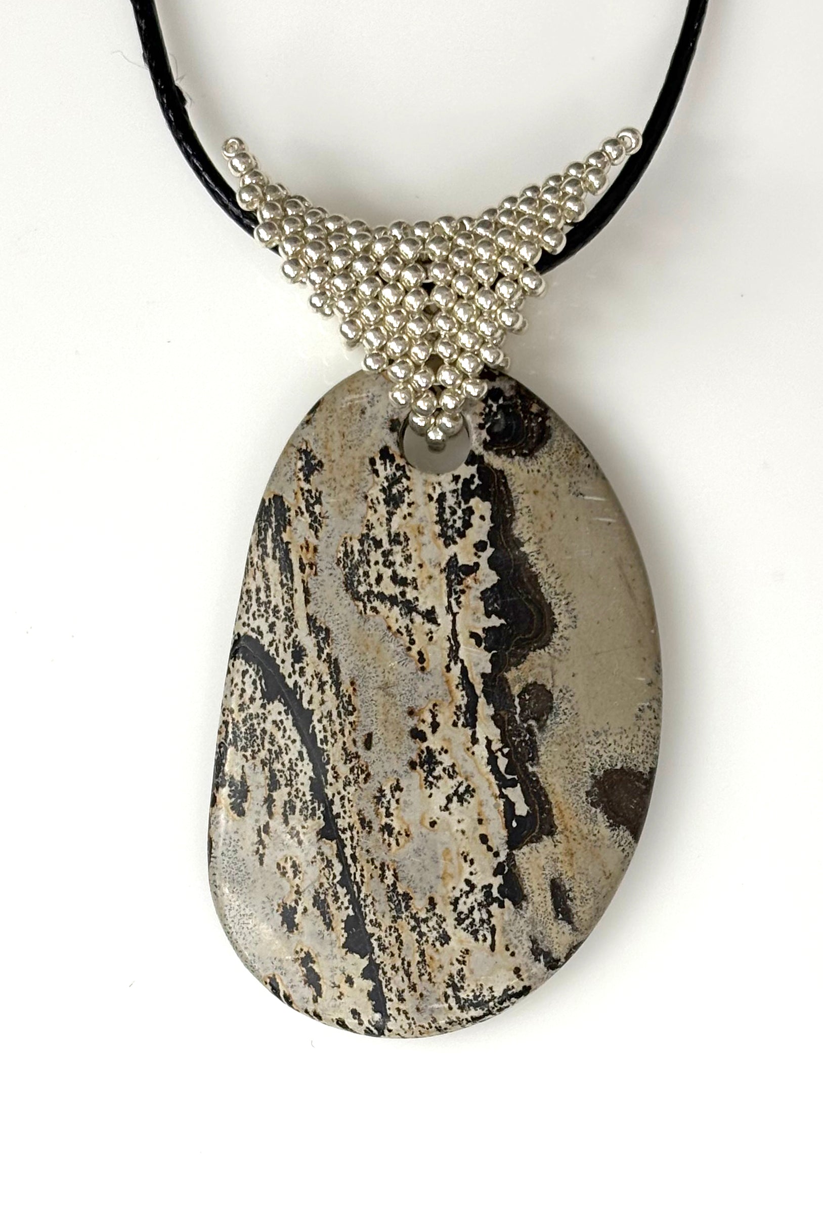 Semi-precious gemstones (1" - 2 1/2") suspended on 18"waxed cotton cord. Highlighted by bail of intricately woven seed beads.