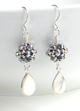 2mm faceted beads and silver seed beads are woven into an intricate beaded bead, with a teardrop mother of pearl dangle. On sterling silver fish hook earwire.